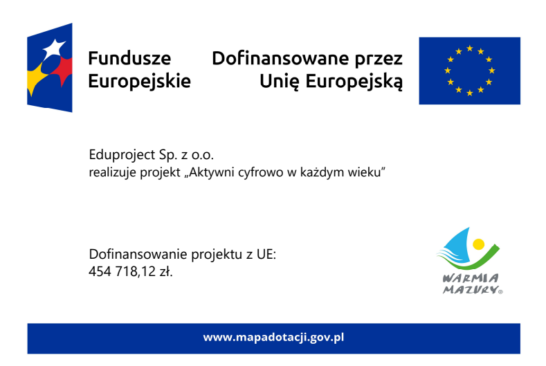 Projekt „Aktywni cyfrowo w każdym wieku” jest współfinansowany z Europejskiego Funduszu Społecznego Plus w ramach programu regionalnego Fundusze Europejskie dla Warmii i Mazur 2021–2027.